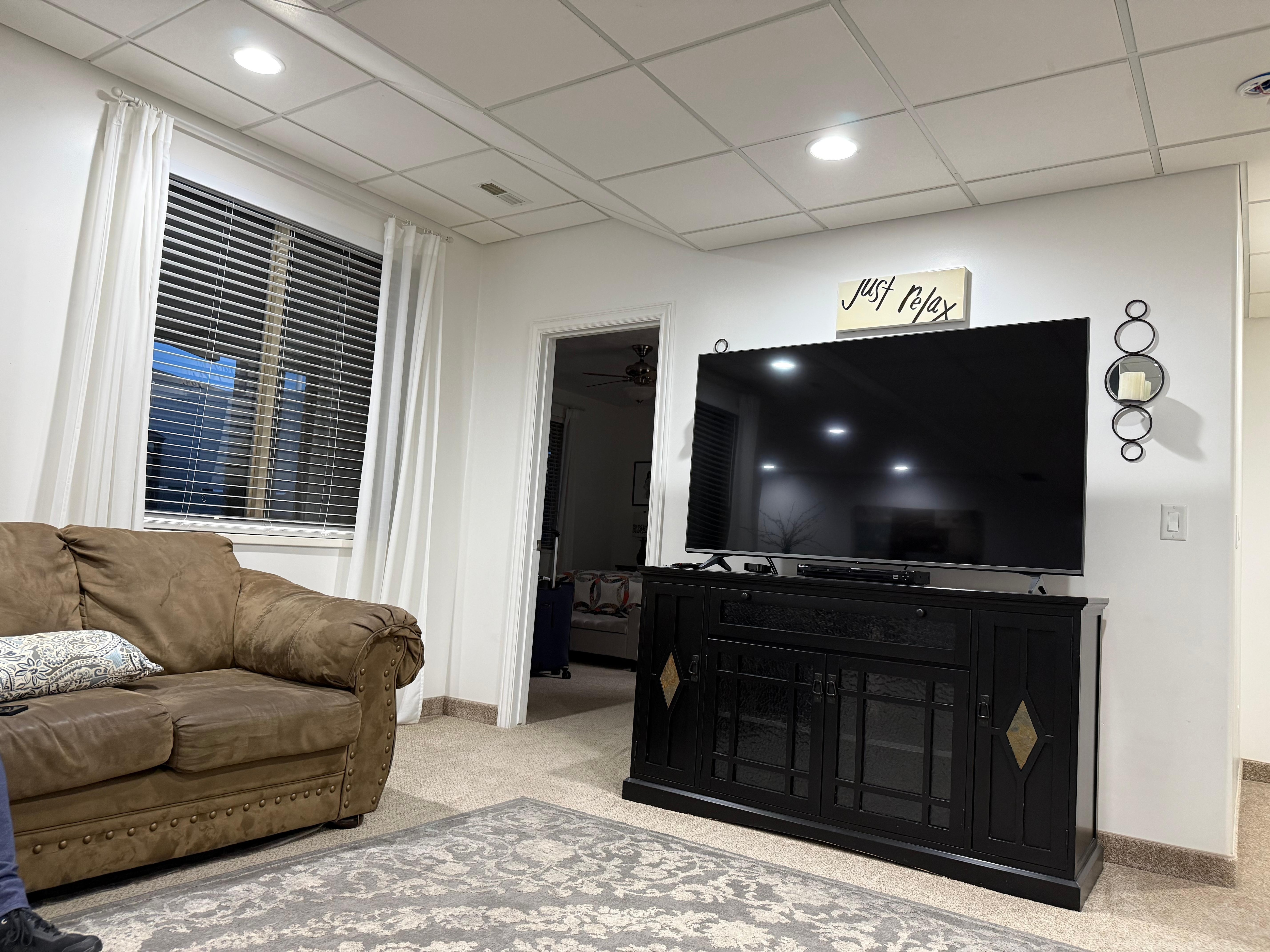 This VRBO has a flatscreenTV, Bluetooth speaker cable & high speed internet. Phone chargers are provided for your convenience