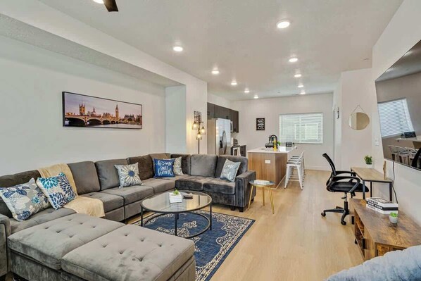 Snow settles softly over the neighborhood as city lights glow nearby, creating a calm retreat that feels closely connected to the rhythm of Salt Lake City. After a day of exploring downtown or heading to the nearby Great Salt Lake, you return to a warm, comfortable home where quiet evenings, glowing screens, and shared meals make it easy to unwind. The space balances private corners with shared areas, giving you room to spread out while staying connected to everything around you.