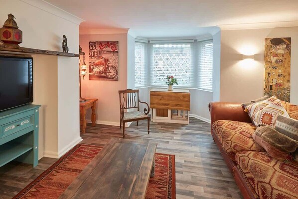 In The Key Of Sea has a quirky, bohemian style open plan kitchen, living and dining area. Featuring a shabby chic, leather patchwork sofa and a flat screen TV, this space is ideal for cosying up with your loved one after a day at the beach. Fully equipped for self-catering staycations, the kitchen has modern appliances and cookware so you can enjoy home cooked meals throughout your break. There is a fold out dining table and two chairs in the bay window.