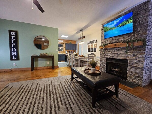Cabin 8 is now our newest and largest cabin at Saluda Grade Cabins. Inside you will find sleeping accommodation for up to 14 guests! You will also find central heat & air, 4 bedrooms, 2 bathrooms, and plenty of communal outdoor space to enjoy during your stay. Cabin 8 provides the perfect retreat for a relaxing, peaceful vacation. This cabin sleeps 14 guests comfortably with 2 king-size bed, a sofa bed, two sets of twin bunkbeds, and one set of queen bunkbeds. Other features include a large fully-equipped kitchen with a full-size oven, fridge, coffee maker, and microwave, a bathroom with shower and heated tile floor, an electric fireplace, and ceiling fans in each bedroom and living area.