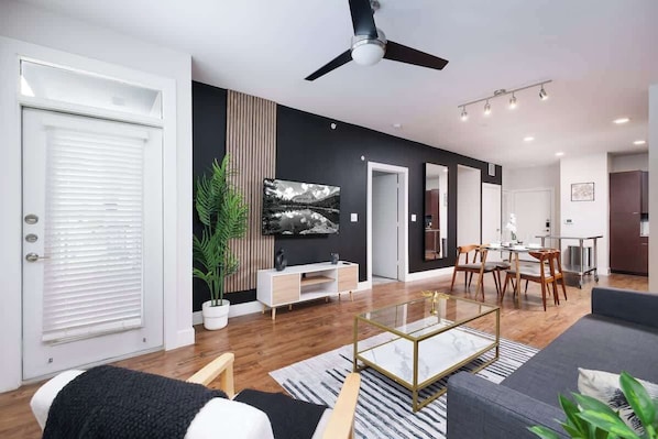 Living: Cozy area, 65" HDTV, Apple TV, Disney+, HBO Max, Hulu, Netflix