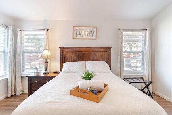 - Master Bedroom: Spacious with a queen bed, dresser with mirror, walk-in closet, 40-inch smart TV, luggage rack and en-suite bathroom.