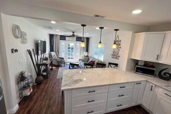 Inside, the home boasts an open-concept layout, featuring a large eat-in island in the kitchen, perfect for family meals or casual entertaining. Freshly painted and fully equipped with modern amenities, it’s the perfect spot to relax after a day at the beach.