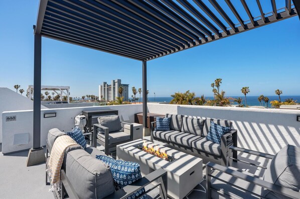 One of the highlights of this home is the rooftop deck. This breathtaking outdoor space provides panoramic views of the Pacific Ocean, making it the perfect place to relax and soak in the sun. Amenities include lounge seating, a dining set, a shade structure, and a fire pit. Enjoy a glass of wine or a delicious meal as you take in the coastal San Diego vistas.