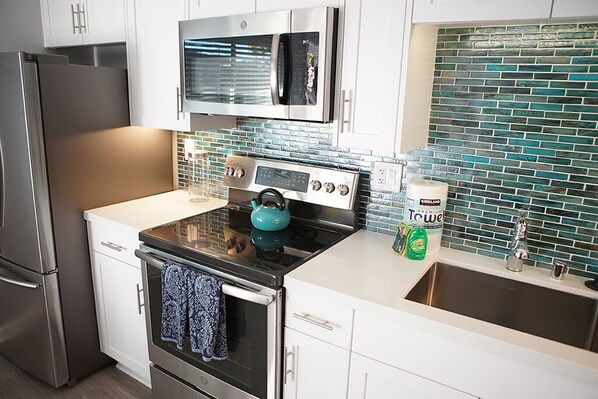 We highly recommend this apartment! We loved how everything felt new and super clean. Having a separate bedroom instead of studio was a perk with tasteful barn door. Enjoyed having a bathtub and shower combination with strong water pressure and extra hot water for tub soak. Shampoo and soap provided. Kitchen was stocked with new dishes, coffee marker and coffee/cream. Beach towels, beach chairs and umbrella provided in closet. Air conditioner and ceiling fan in bedroom with a good firm mattress made for good night rest. We stayed 6 days. New washer/dryer came in handy. Best feature was location steps from both ocean side and Bay side. Loved it!
