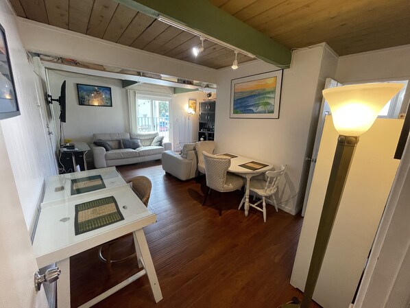 Questo spazioso 650 mq. Ft. (Interno), 150 mq Ft. (Balcone esterno) 1 camera da letto 1 bagno al piano superiore Duplex si trova nel cuore di Pacific Beach. A pochi passi dalla baia (5 isolati) e dalla spiaggia (10 isolati). A pochi minuti di bicicletta dalla spiaggia. È stato rinnovato con pavimenti in legno, finestre in vinile e porta del balcone, microonde sospeso, Trex Deck e nuovo 60 "HD TV a schermo piatto con audio surround. Wi-Fi Internet, Digital AT & T Uverse HD Cable, ponte personale con bellissime piante tropicali, 2 acquari per intrattenere, lavastoviglie, smaltimento dei rifiuti e lavatrice / asciugatrice in loco, Sentitevi liberi di raccogliere la frutta dalle piante che crescono sul posto.