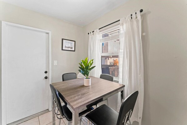-Dining Area: Enjoy meals at the small but functional dining area with views of the neighborhood.