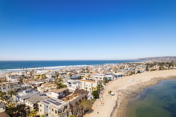 Mission Beach is San Diego's lively take on the classic boardwalk beach town with over five miles of waterfront boardwalk, trendy shops, restaurants, and Belmont Park, a beachfront amusement park featuring the historic Giant Dipper Roller Coaster, originally built in 1925 but since restored, miniature golf, bumper cars, rock climbing, and an arcade. Mission Beach is just a few minutes to Sea World, 15-20 minutes to The San Diego Zoo, Balboa Park, San Diego International Airport (SAN), and downtown San Diego.