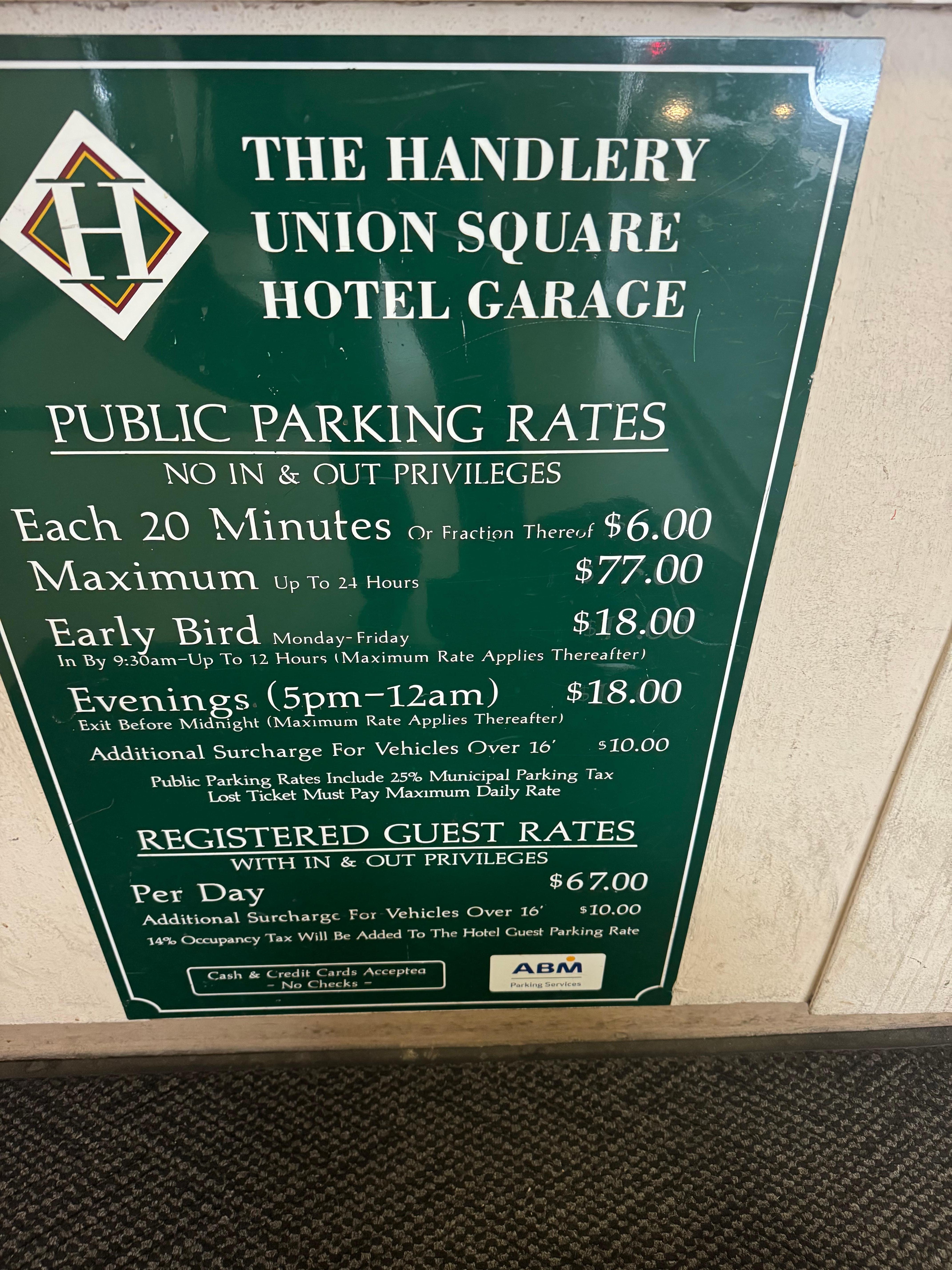 The hotel location is perfect, close to everything in Union Square. However the guest overnight parking is $67 which is outrageous. I don’t care how expensive the city is. They should at least give a discount to the guest.