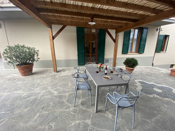 Porzione di Villa dotata di ogni confort con spazio esterno esclusivo. Possibilità di pranzare e rilassarsi all'aperto.
