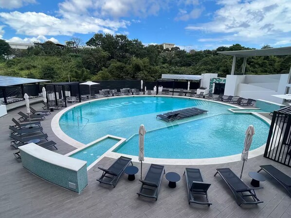- Great outdoor pool area for the whole family topped with lounge chairs, showers, bathrooms, chairs, tables and kitchen sink areas.