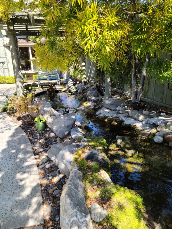 Located in a beautiful. serene community, 10 min bike ride & 5-min drive to a spectacular white sand ocean beach & nude beach. 9 min to lovely downtown San Luis Obispo. Our property, on a quiet cul de sac, is airy and light-filled, with three bedrms/ 3 ba, office + cottage, grand panoramic views, a koi pond with stream and miniature waterfalls and a sauna. One bathrm has a shower seat and toilet handrails.