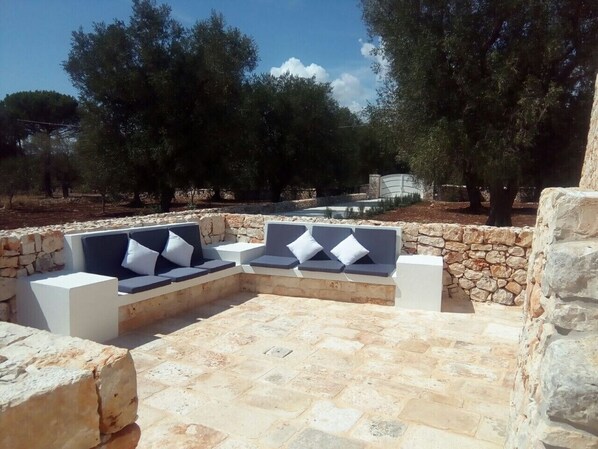 All’esterno è presente un ampio piazzale, lettini per il solarium, doccia, area relax con divani in pietra ricavati nell’antica corte, un ampio gazebo attrezzato con tavolo, barbecue e cucina.