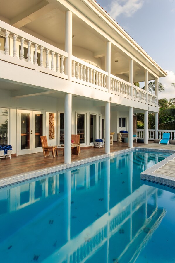 Raffreddata dalle brezze del mare orientale, questa spettacolare villa presenta una palapa sul tetto, tre palapas sulla spiaggia e una palapa all'estremità del molo! Aree relax sulla spiaggia, sul tetto e a bordo piscina.