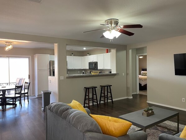 Perfect for vacations, temporary work relocation, or a place to stay while searching for your new home. Located between the San Tan and Superstition Mountains in a quiet community. Close to golf, hiking, grocery, restaurants, medical, and more! Premium linens and towels, fully equipped kitchen, and Smart TVs. One of the best features is the back patio with open views.