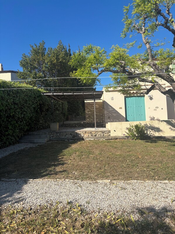 Detached ground-floor apartment with terrace, garden and parking.