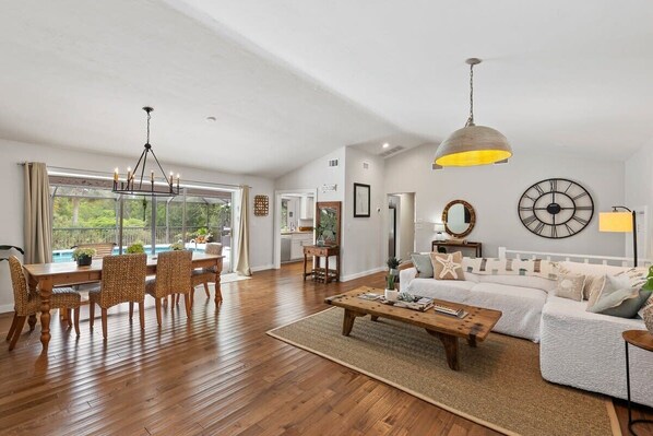 There is a pass-through window from the kitchen to the lanai, making is easy to dine al fresco while sitting by the pool, cooking on the brand-new gas grill, and enjoying the tropical view. If you prefer to dine indoors, there is a gorgeous dining room table that comfortably seats 6 people and looks out onto the pool.