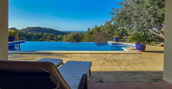 It is necessary to highlight the magnificent infinity pool, a real luxury. Located on the north face of the house, it has beautiful views of the countryside and the sea. Around the pool there is a large terrace with stone floors, hammocks, umbrellas and a great carob tree that provides a pleasant shade where to relax.