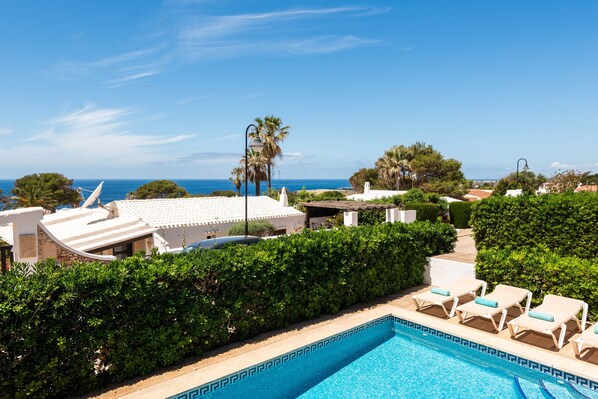 With its beautiful contrast between the radiant Menorcan white and the natural wooden beams, Bini Luna is a beautiful example of the Mediterranean lifestyle, a really cozy house, which will give you all the holiday comfort you can ask for. The master bedroom has a double bed and bathroom en suite. The other two bedrooms have single beds and share a bathroom. The house has a large living-dining room, a fully equipped kitchen and a laundry room. The great large covered terrace with sea views and the pool complete the whole thing to an ideal result, the perfect place to relax.