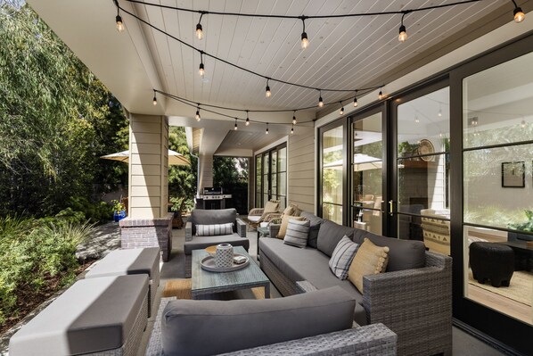 Outdoor living is fantastic in this home. A dining table seats six, a gas grill, and additional seating to relax after a long day at the beach!