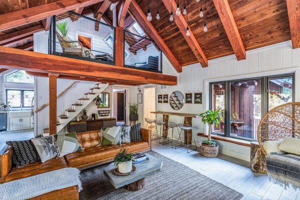 Tap into your inner child climbing into the second loft area, above part of the living room, via the beautifully designed black iron loft ladder featuring wooden rungs take from wood off of the property. In this loft sitting area we have seating and a futon that pulls down into a full sized bed for extra guests.