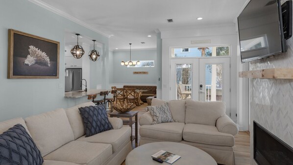 The 1st floor of this home is the main living area with a spacious kitchen overlooking the beautiful dining area. Everything is light, bright, and beachy here. Out the back door is a gas grill and fire pit area with more seating for all of your outdoor gathering needs.