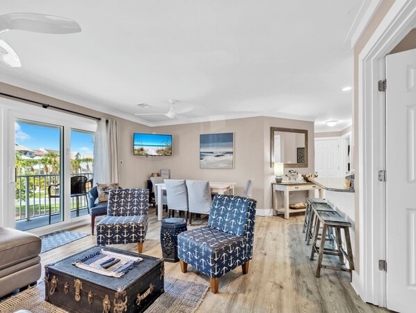 Step inside and feel instantly at ease in the bright, open living space featuring contemporary furnishings and coastal-inspired décor. With two king beds and two twin beds, this home comfortably sleeps up to six guests — perfect for families or a group of friends.