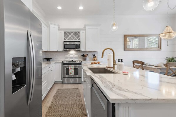 Step into the spacious and elegantly designed living area, where coastal charm meets modern luxury. The open-concept layout allows for easy interaction among guests, whether you're enjoying a movie night or a family meal. The fully equipped kitchen features top-of-the-line appliances, perfect for whipping up your favorite dishes. Three of the four bedrooms boast en-suite bathrooms, providing privacy and convenience for all guests.