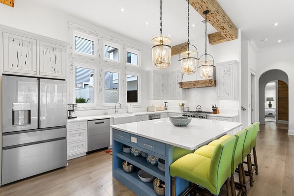 1st/Ground Floor: A cozy and chic foyer greets you with entry table—outfitted with dozens of games for your enjoyment, and two plush chairs. You’ll then enter the main living area which has high ceilings and is full of light. The open concept kitchen is outfitted with luxe stainless appliances including a 6-burner gas range. The large island has bar seating for 4. The living room includes two large, comfy sofas, two side chairs, coffee and side tables and large flat screen “Frame” TV. The large dining table seats up to 14. A convenient half bath is just off the hallway as well as a closet with stackable washer/dryer (one of two laundry areas). There is one bedroom on this level, a King master with private full bath including a large tub/shower combo. This bedroom also includes a hi-def TV, two closets and French doors leading to an outdoor seating area with comfy sofa and chairs and a gas fireplace.