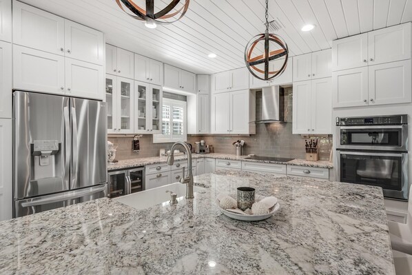 Wood Beach Retreat offers guests a professionally decorated and recently remodeled Seagrove Beach home. This home is a single-story home and features an elegantly designed living room with a large flat screen television and amble seating for everyone to enjoy. The gourmet kitchen that is fully stocked with top-of-the-line cookware, dinnerware, and serve ware and stainless-steel high-end appliances is a true 'dream' kitchen.