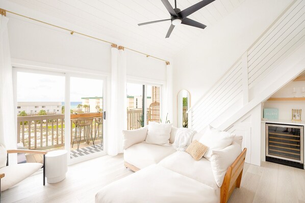 The loft-style bedroom features two queen beds and sits above a fully equipped kitchen and bar area, opening up to a bright living space with an inviting sofa for relaxing after those long beach days.