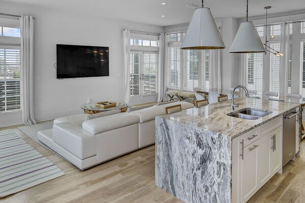 Il terzo piano di questo ritiro sulla spiaggia ospita lo spazio abitativo principale per la casa. Un concetto aperto di soggiorno, sala da pranzo e cucina lo rendono il fulcro di tutta la casa. Questa cucina gourmet soddisferà sicuramente lo chef della tua famiglia. Il marmo italiano, isola cucina in stile cascata, fissa la stanza con la sua collocazione perfetta per intrattenere. Il tocco moderno e sofisticato della sala da pranzo con le sue sedie fantasma e il suo elegante tavolo bianco è sicuro di portare ogni pasto di alto livello quando si tratta di raffinatezza. I soffici divani del soggiorno sono perfetti per immergersi dopo una lunga giornata esplorando su e giù per la panoramica autostrada 30A. Il balcone esterno esposto a sud offre l'allettante opzione per cenare all'aperto con il suo tavolo da pranzo per otto e vista sul Golfo.