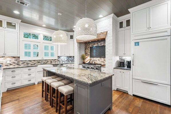 This beautifully crafted residence welcomes guests with thoughtful design and relaxed coastal charm. The entryway opens to a bright living space accented by shiplap walls, natural textures, and exposed beams that set a tranquil tone. The chef's kitchen includes granite countertops, a Thermador range with double ovens, and a spacious island that encourages gathering while meals are prepared. The open floor plan connects the kitchen, dining, and living areas, creating the perfect setting for family time and entertaining. A queen guest suite and a convenient half bath complete the main level.