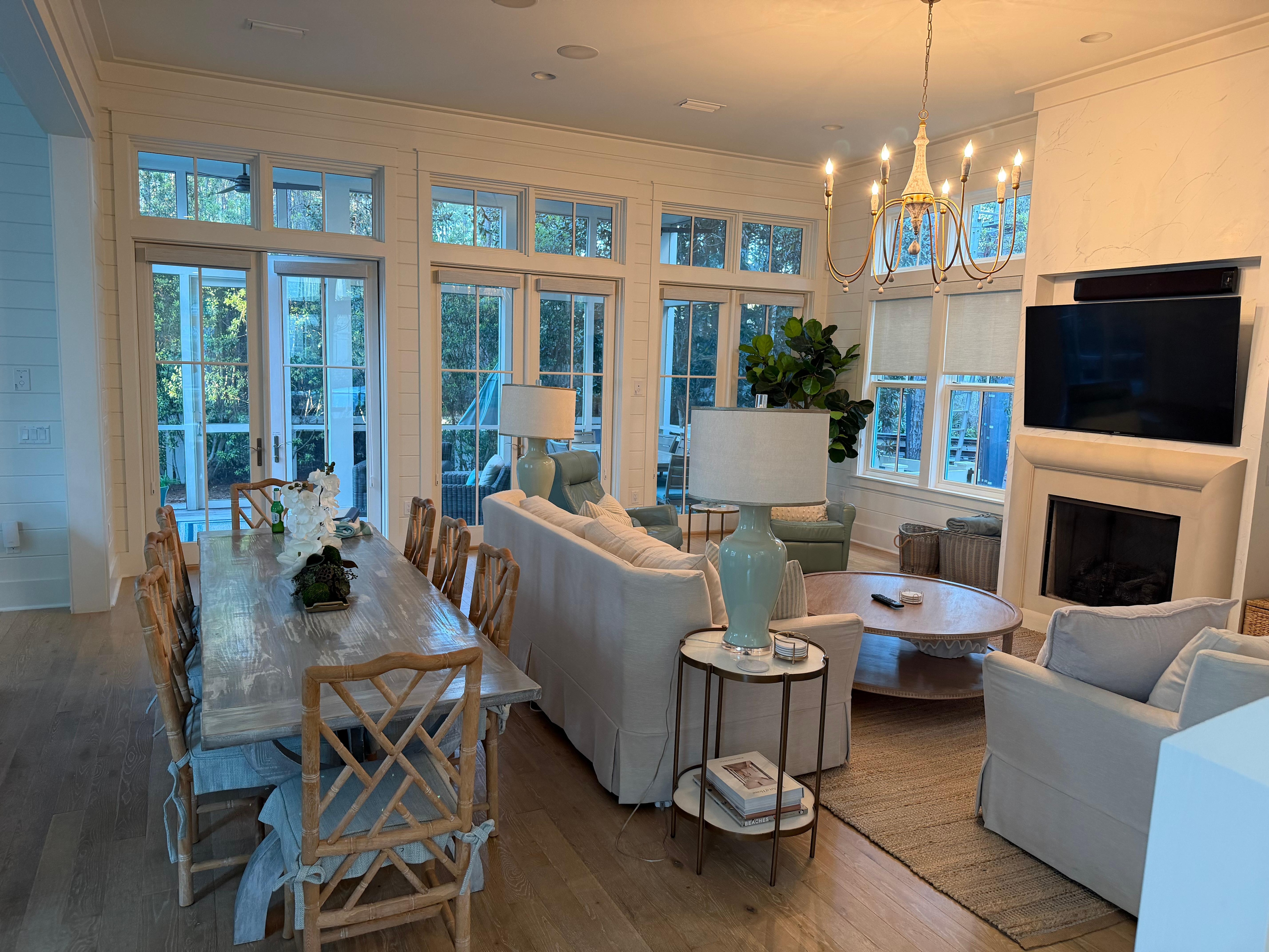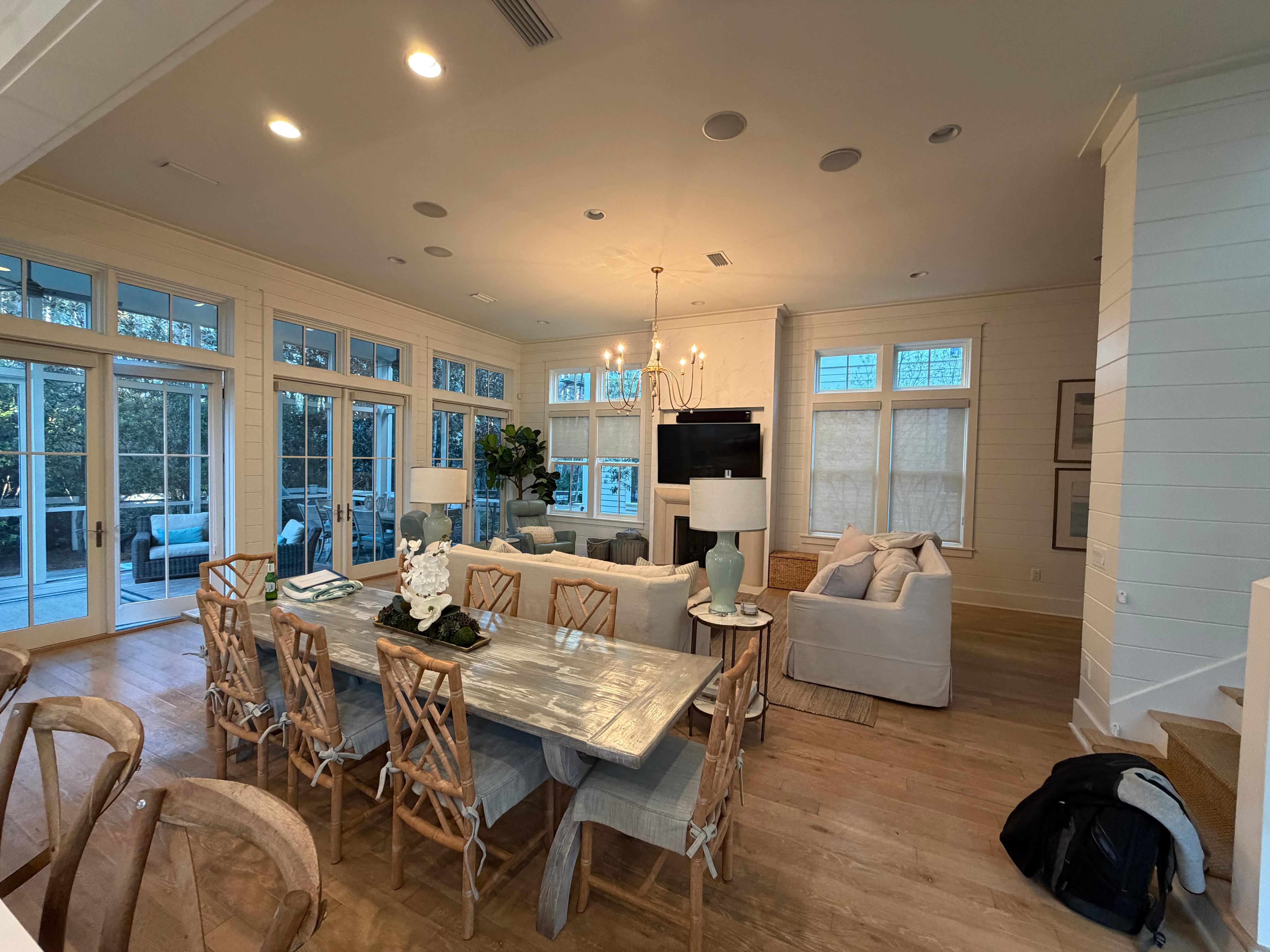 -grande Camera aperta familiare con Smart TV, streaming sistema audio, tavoli da pranzo e di gioco, e camino a gas.