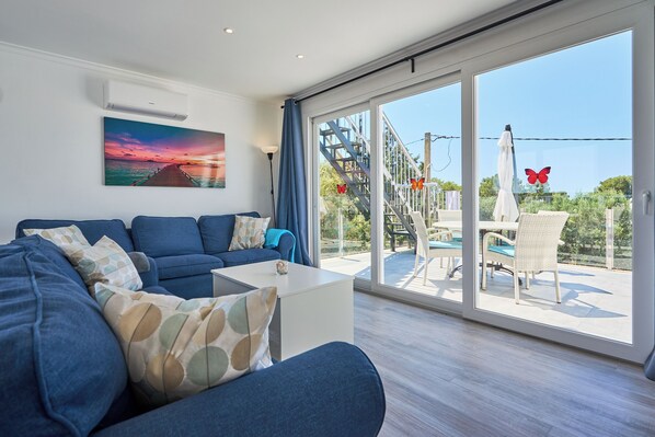 An external staircase leads to the upper floor, where there is a living room with access to a small terrace offering panoramic views of the port of Porto Petro. On this floor, there are three more bedrooms. One with two single beds and the other with a double bed. Adjacent to these bedrooms you find a bathroom with a bathtub and separate shower. The last bedroom has a double bed, a sitting area, a bathroom with a shower, and access to a small terrace.