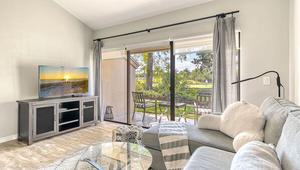 Open the sliding door to the patio with outdoor furniture and enjoy the view with the sunlight, peace and quiet.
