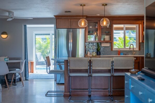The fully-equipped kitchen is a chef's dream, featuring modern appliances, ample counter space, and all the essentials needed to whip up delicious meals and snacks. 🍽️ Enjoy your culinary creations at the dining table, or take your meals al fresco on the private patio, where you can savor the fresh Gulf breezes and soak up the sunshine. 🌞