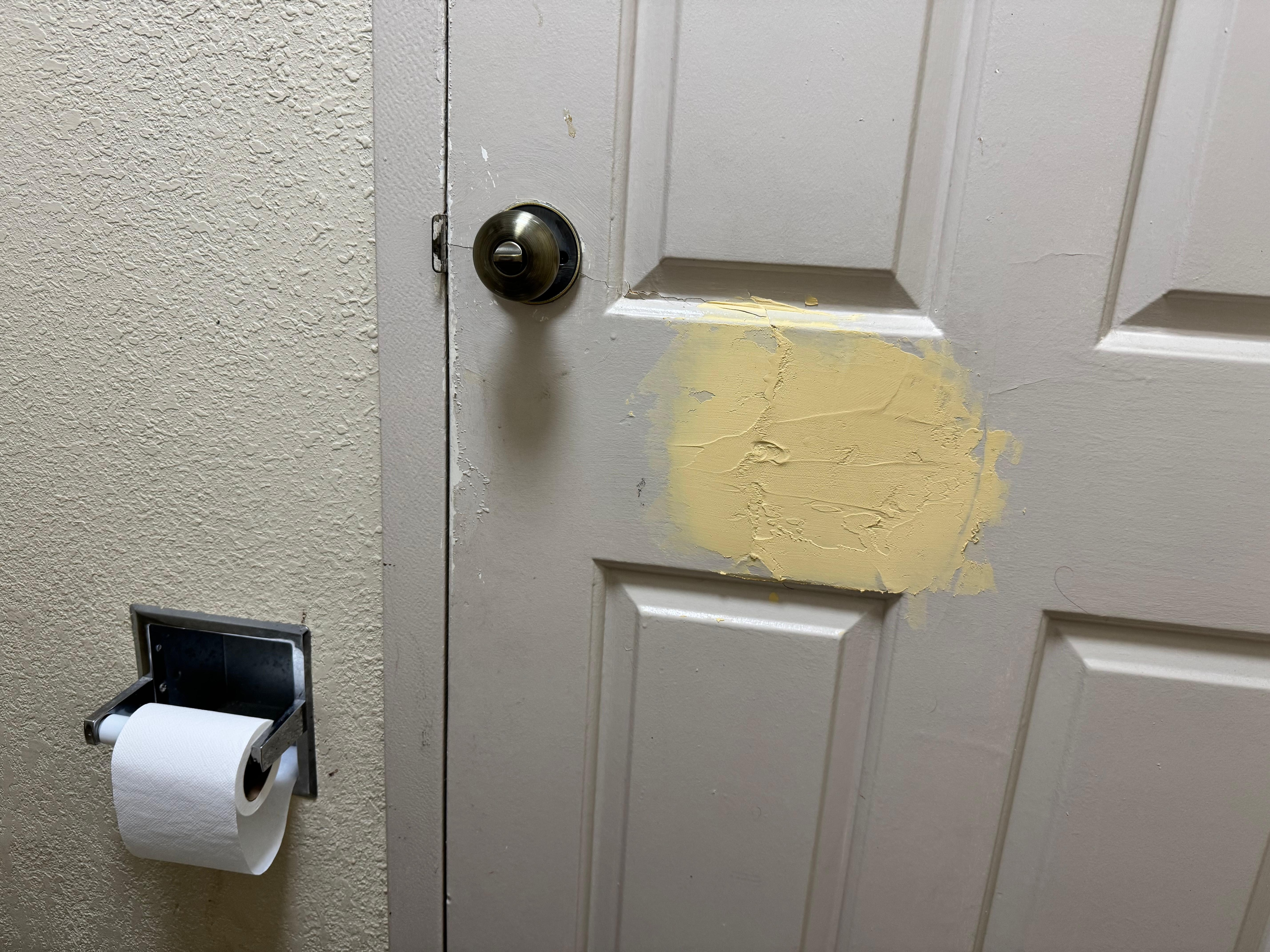 Bathroom was cramped. I had to step inside the tub to close the door. Bathroom door had been patched in a different color. Tiles around bathtub were cracked.
