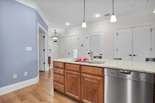 The primary bedroom is a serene retreat, featuring a plush king bed, ample storage, and a private en suite bathroom that adds a touch of hotel-style luxury. The second bedroom is both fun and functional, offering a bunk bed with a full-size bed on the bottom and a twin on top, along with its own en suite bathroom—ideal for families or friends traveling together while still enjoying privacy and comfort.