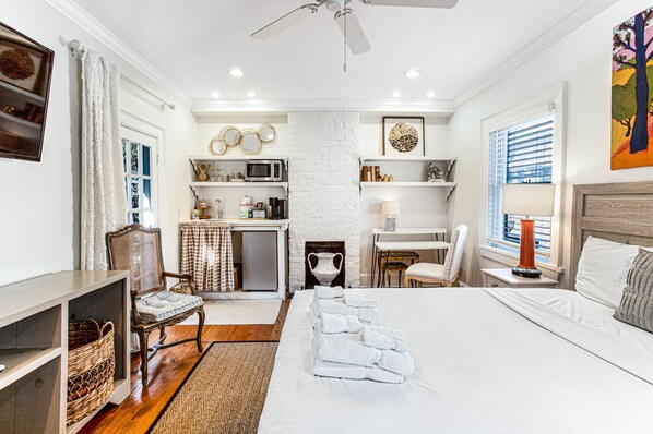 The queen size bed is centered in the middle of the room, with a large smart television mounted for your enjoyment at the foot of the bed. Just across, you'll have a quaint kitchenette, equipped with a Keurig, mini-fridge, and microwave; perfect for this cozy carriage house! After a long day of exploring our beautiful city, rinse the day away in the spa-like walk-in shower, and enjoy an evening glass of wine on your private balcony.