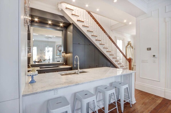 Covered from head to toe in original artwork, much of which is actually produced by the owner and her family, you will feel as though you’re strolling through a private art gallery. Just pour a Merlot, and let your curiosity and imagination run wild as you admire all the little details. The living room is the perfect place to relax and entertain your guests with plenty of comfy seating, a smart TV and lots of coffee table space to gather ‘round and play some cards. Settle in to the azure blue Chatsworth Room, the owner’s interpretation of an English “snug”, for an evening of conversation and cocktails beneath the soothing glow of pierced metal lanterns. Let the conversation spill into the open dining room and kitchen as you enjoy the large formal dining table surrounded by authentic Louis Ghost Chairs, or perch on a stool at the spacious, Carrara marble bar. The sleek kitchen is an entertainer’s dream, with ample counter space and everything you need to show off your culinary and mixology skills to the group as you whip up some hand-crafted nibbles and drinks before heading out for the night. After all the fun, head upstairs to one of the three exceedingly comfortable bedrooms. Blissfully unwind in the delightful master suite, where you’ll find a sumptuous king bed, and an extravagant marble bathroom with both a rain shower and a soaking tub. The second bedroom, a sublimely bright and cheerful room, has a diamond-tufted king bed and shares a hall bath with the third bedroom, an enchanting room with another, wonderfully cozy king bed. Each bedroom has floor to ceiling boutique closets, so if you like to have plenty of outfit choices for the day, we’ve got you covered.