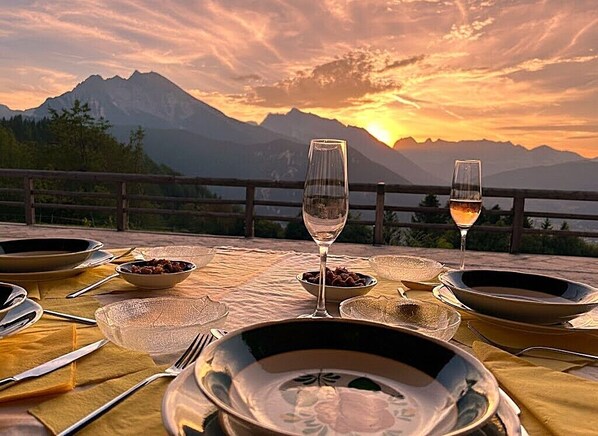 L'appartamento ha la sua terrazza con una vista libera del Watzmann, la catena montuosa di Berchtesgadener e la valle.