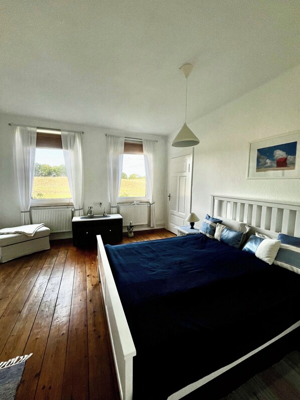 The apartment is freshly renovated (Oct. 2023) offers cozy living comfort with plenty of space. Through a separate entrance you enter the large hallway lined with terrazzo from which the 2 spacious bedrooms , 1 children's room and the full bathroom with shower tub and the rustic with solid wood furniture equipped and well-equipped kitchen depart. 2 of the bedrooms as well as the clock cozy living room equipped with its own fireplace offer direct views of the surrounding fields. The design of the interiors give the apartment a rustic coziness. In addition to washing machine, an extra sofa bed, radio, books and LED TV, the apartment has a fiber optic connection, so fast internet is provided.