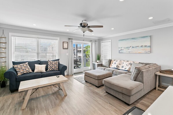The open-concept design makes it easy to relax and reconnect. The bright and airy living room features plush seating, a flat-screen TV, and tasteful coastal décor—perfect for lounging after a day at the beach.