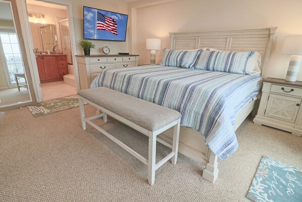 Level 1: Master bedroom with King bed, full master bathroom, his and her closets and balcony with table and chairs. Flat screen smart tv.
