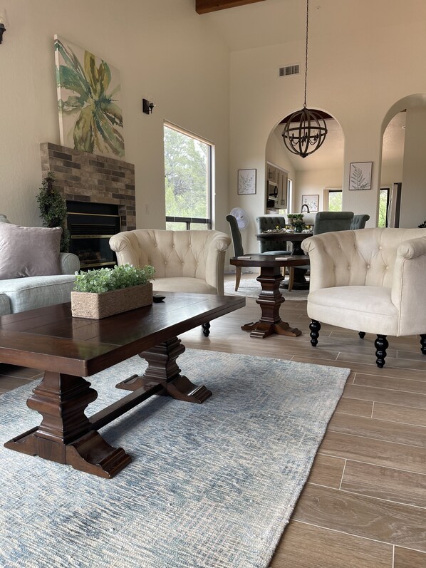 Spacious 1900 sq. ft. Two bedroom / two bathroom home with vaulted ceilings and skylights. Enjoy cozy nights next to the fireplace or relax in the living room watching your favorite shows. Each bedroom features a memory foam King size bed and Smart TV’s. Pull out sofa and high end air mattress allows space for up to 8 guests.
