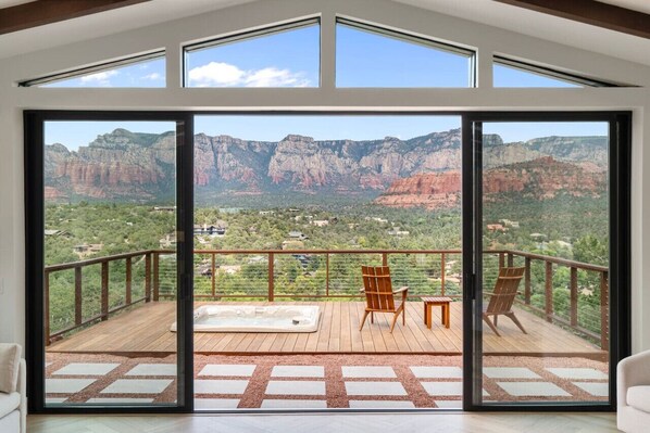 Step outside to a massive patio featuring a 400 sq. ft. cantilevered deck, where you`ll be surrounded by breathtaking, unobstructed views of Mammoth Rock, Courthouse Butte, Bell Rock, Schnebly Hill, and the stunning Sedona landscape. Designed for both relaxation and entertainment, this outdoor oasis includes a 6-person saltwater hot tub, perfect for soaking under the stars, two hammocks for unwinding amidst nature, a fire pit for cozy evenings, and a spacious dining area ideal for enjoying meals with a view. Whether you`re sipping coffee at sunrise or toasting to a spectacular Sedona sunset, this space offers an unforgettable experience.