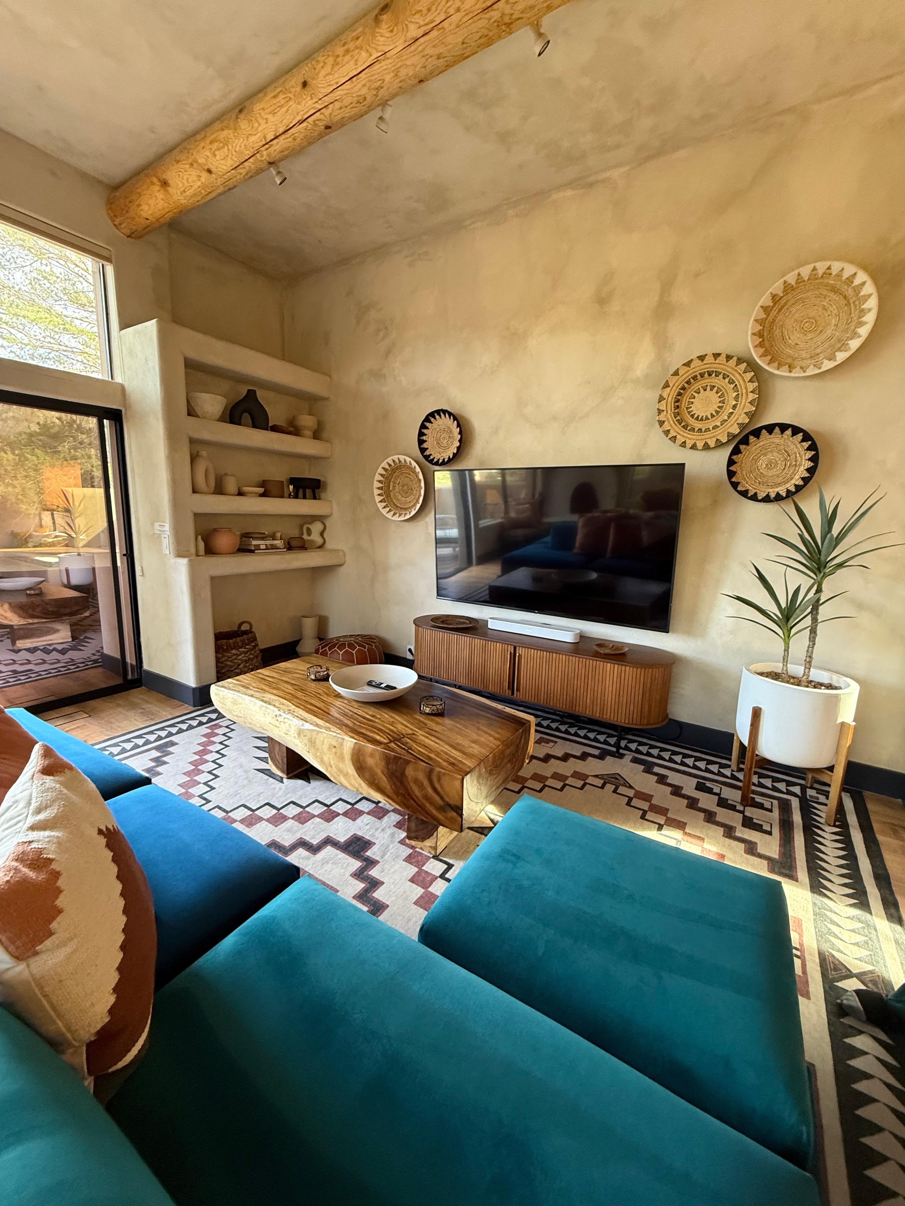 From the front door, you'll be greeted by the split-level staircase leading into an architectural great room that anchors the home. The upper-level main living area seamlessly connects the living room, kitchen, and dining space, creating an open, airy flow designed for gathering and relaxation. The entire home features Southwestern pueblo interior design, enhanced by warm textures and natural light.