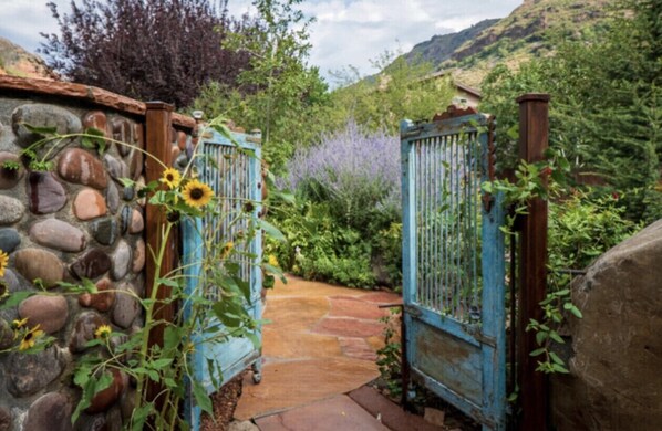 The back yard is a true oasis with gorgeous views of the canyon on all sides. The sound of the flowing creek (you can hear it, but can't see it from our property), and the chirping of the plentiful birds the canyon attracts is very relaxing. There is a large outdoor sectional, two swivel chairs, two lounge chairs, and a circular day bed for your use during your stay. There is a wood burning fire pit (you are responsible for providing your own firewood) and a propane powered BBQ grill.