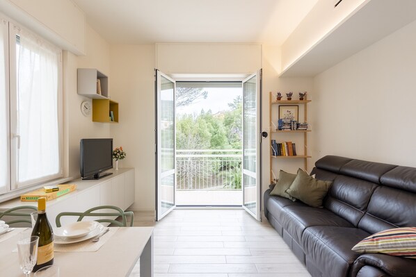 La proprietà dispone di un elegante soggiorno a pianta aperta arredato con tavolo e sedie da pranzo, un comodo divano e una smart TV a schermo piatto. Quest\'area si apre su un piccolo balcone e incorpora una cucina moderna dotata di piano cottura a gas, forno, microonde, macchina da caffè Mokka e frigorifero con congelatore.